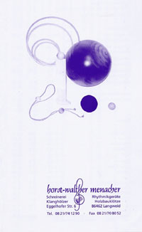 Neben schönen Holzkugeln aus acht unterschiedlichen Hölzern finden Sie bei Horst-Walther Menacher u.a. auch Klötze (Pappel) in drei verschiedenen Größen, Stäbe, Klanghölzer und Gymnastikreifen (Durchmesser: 30-90 cm) in unterschiedlichen Stärken und dünne Holzstäbchen (Mimi Scheiblauer) in verschiedenen Farben. Die Arbeiten von Horst-Walther Menacher zeichnen sich durch eine hervorragende Verarbeitung aus.